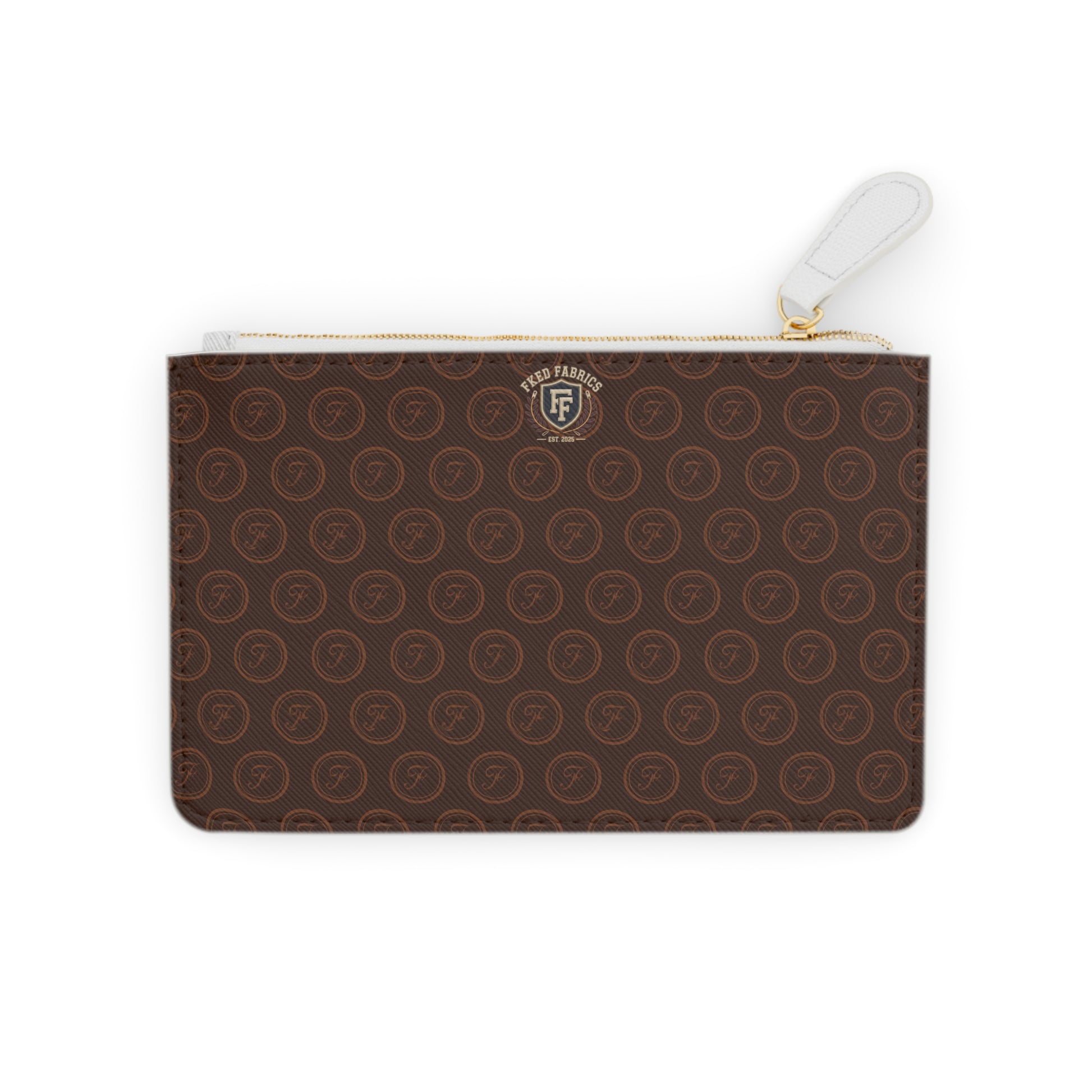 This compact clutch brings quiet luxury to everyday carry. Rich, Saffiano-textured faux leather wraps a slim silhouette printed front and back in deep chestnut tones with a subtle circular monogram pattern. A gold-tone metal zipper and clean black lining keep essentials secure, while an internal pocket holds a cardholder, keys, or lip balm without the bulk. Light enough for a swift errand and refined enough to slip into an evening tote, it lives where function meets elevated style.