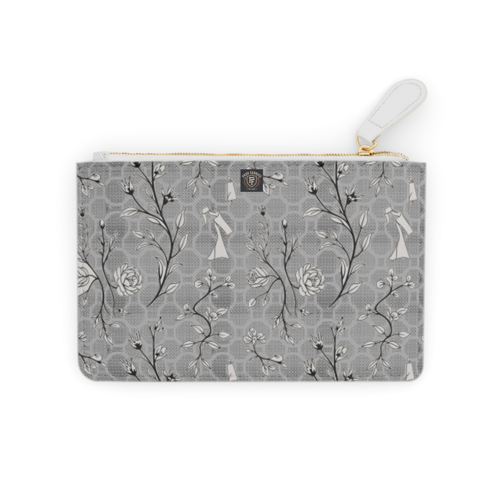 Lightweight and elegant, this mini clutch brings quiet charm to everyday carry. A soft grey Saffiano finish sets off a hand-drawn floral and vine motif in muted tones, creating a refined, vintage-inspired look that slips easily into city life or evening plans. The gold-toned metal zipper and matching pull add a subtle luxe touch while the compact interior and handy pocket keep essentials — cards, keys, a slim phone — organized without bulk. Durable faux leather means you get the look and texture of leather without animal products, and the double-sided print keeps the design visible from every angle. Thoughtful details like black lining and sturdy construction make this clutch feel lived-in and reliable from the first outing.